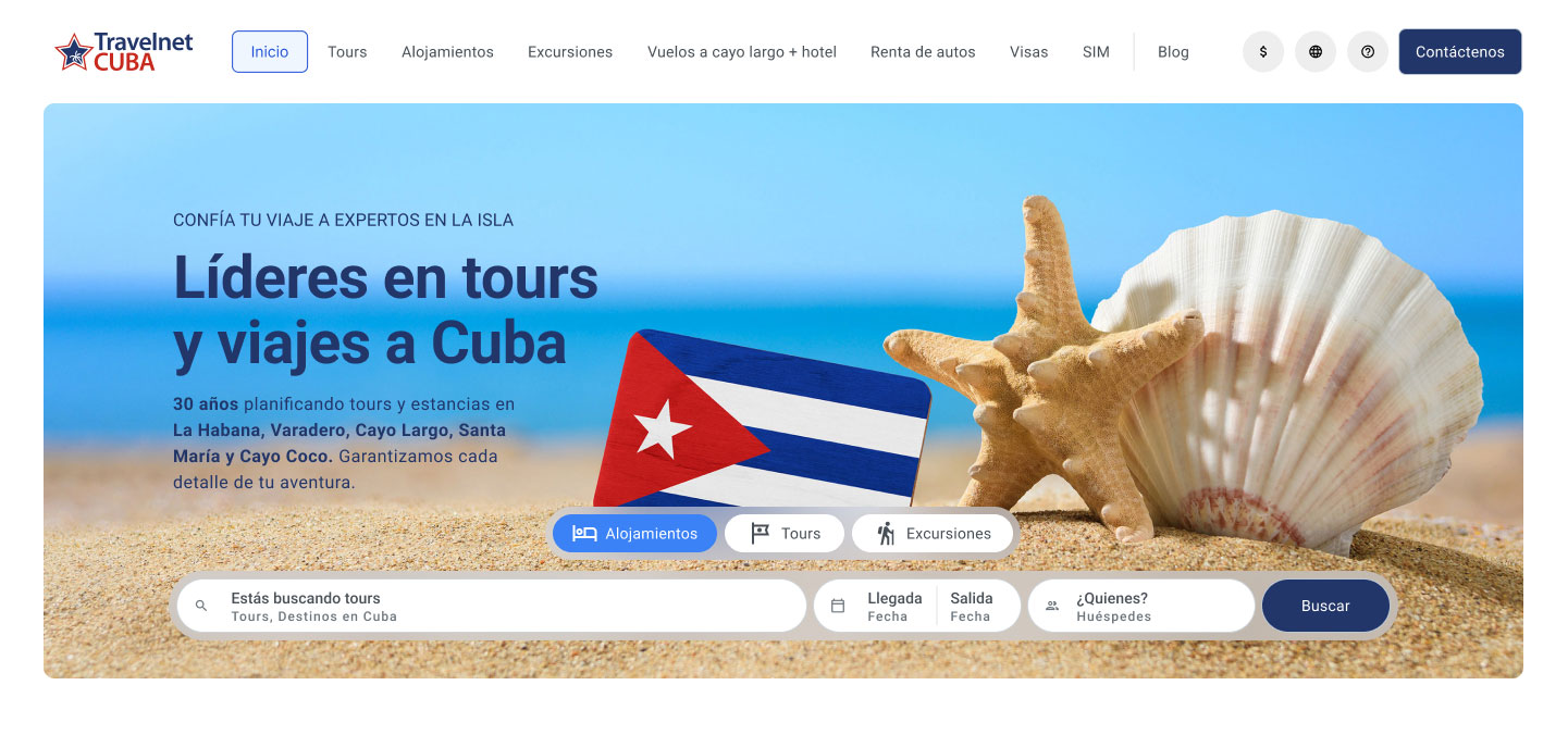Travelnet es una agencia de viajes con sede en La Habana y filiales en las principales zonas turísticas de Cuba. Su plataforma digital existente era un producto arcaico con contenidos desactualizados, arquitectura de navegación deficiente y problemas críticos de usabilidad y accesibilidad. No estaba orientada a conversión — era un catálogo digital sin flujo de venta.