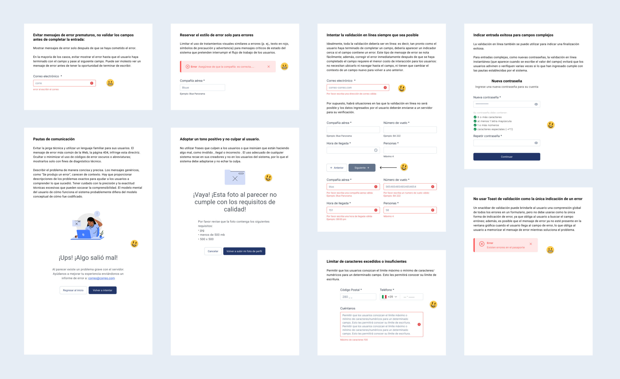 Errores de validación, errores de sistema y errores de conexión con mensajes contextuales y acciones de recuperación claras. Ningún error deja al usuario sin una salida.